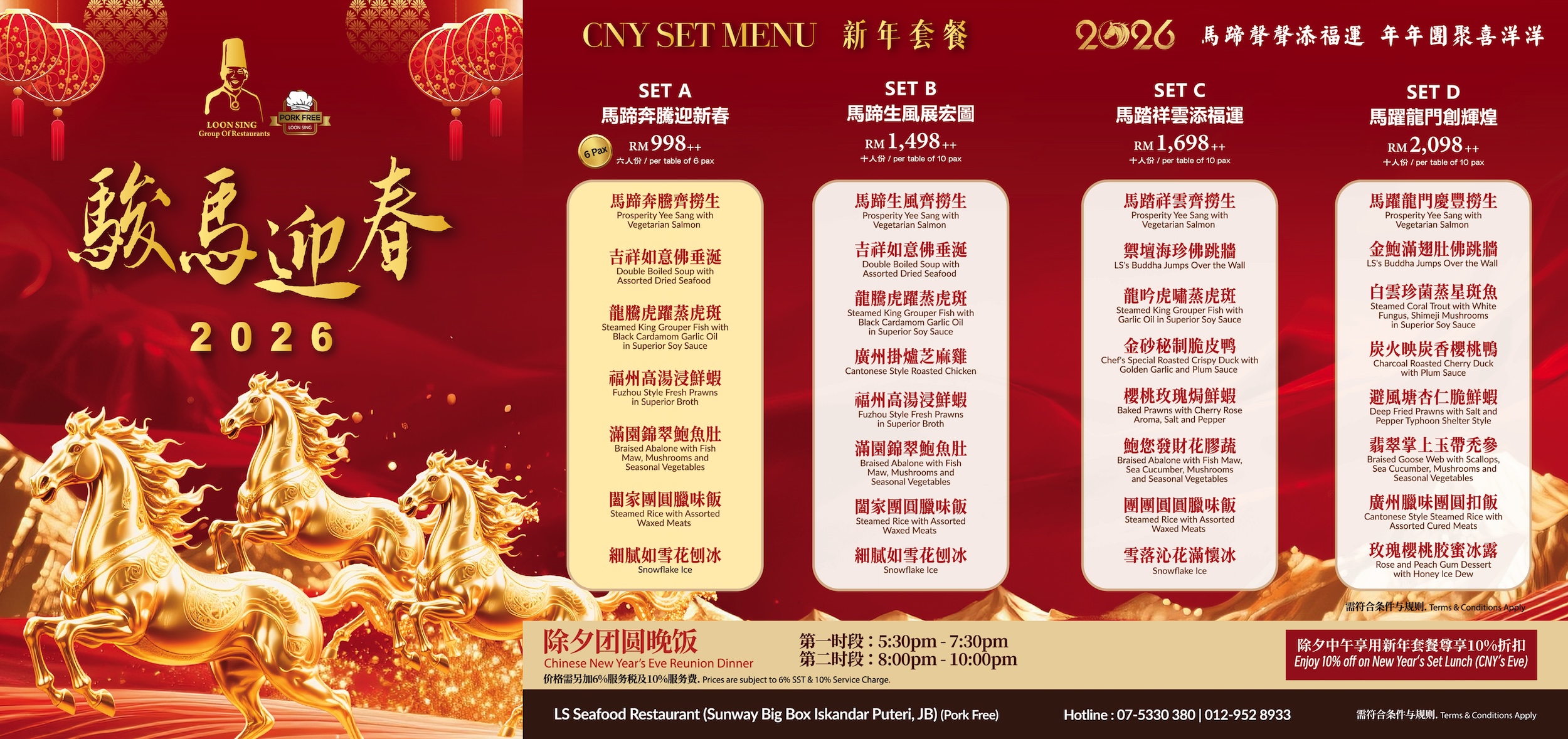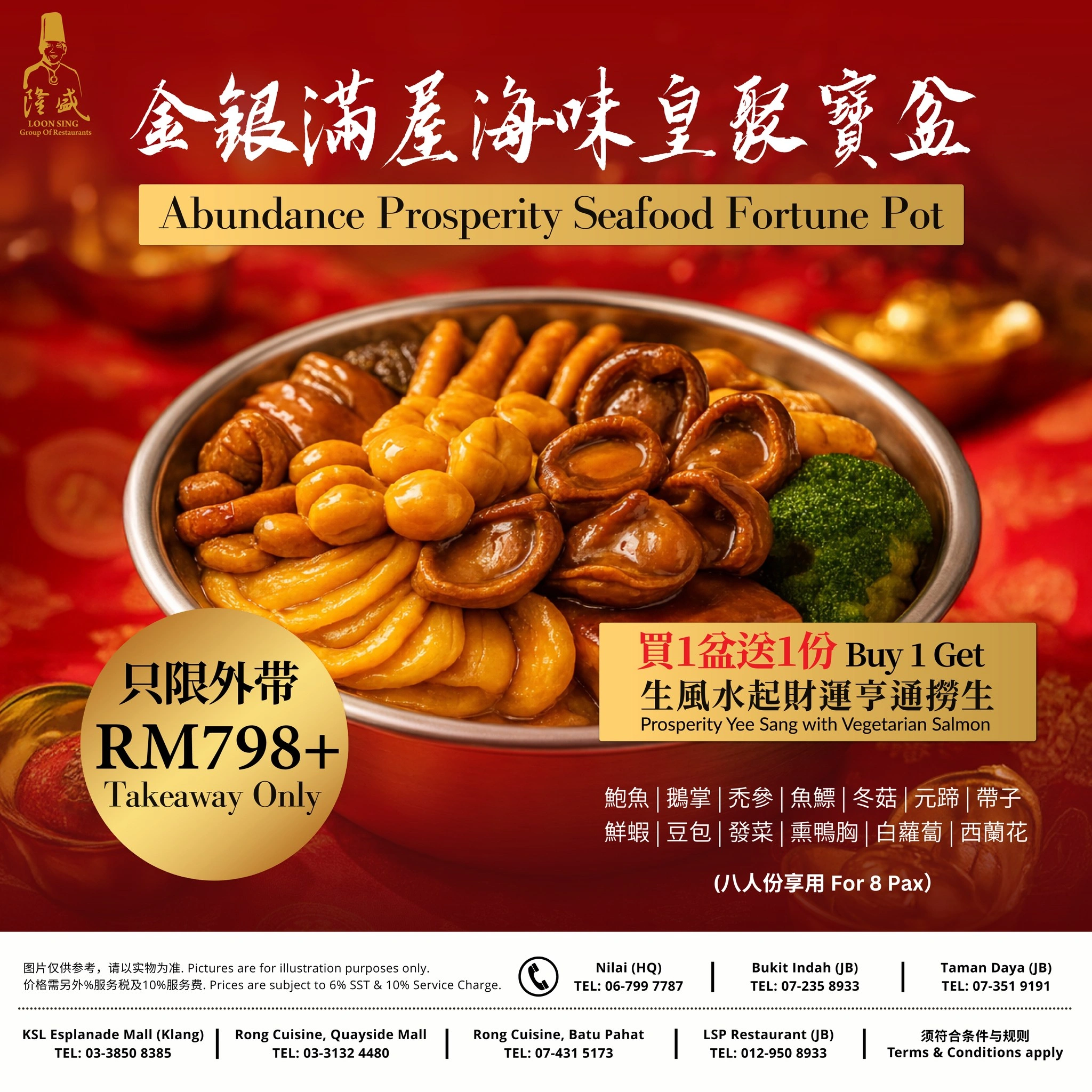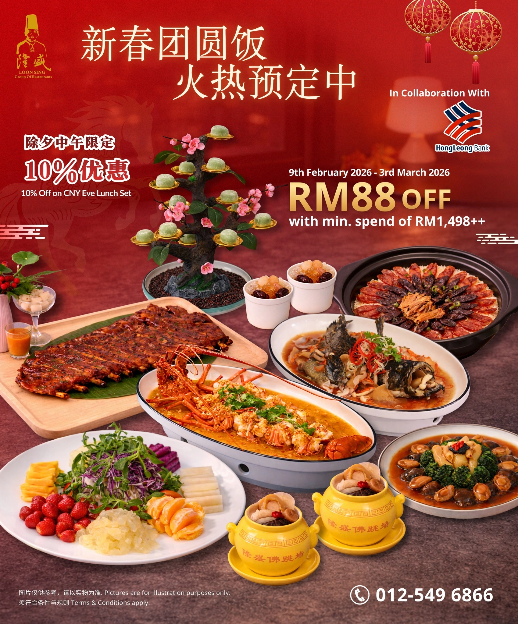 团圆饭的C位非它莫属!隆盛佛跳墙酒家为您精心准备了丰富的年菜,带给您无与伦比的美味体验,成为新山聚餐和jb聚餐的理想之选。盘满钵满聚宝盆(RM698+,8人份),精选海鲜与优质食材,每一口都充满团聚的幸福味道;港式煲仔腊味饭(RM168+,8-10人份),每一粒米都吸满腊味精华,香气四溢,温暖人心;而喜庆团圆腊味饭(RM88+,6人份)则是精致的小家庭选择,圆圆满满,心意满满。每一道菜肴都经过精心调配,确保您与家人一起享受团圆的温馨与美味,带给您无尽的幸福与满足。年夜饭是新一年的期待,快来预定,和家人一起围炉共叙温情吧!只限外带,需提前预订,锁定团圆美味,赶紧行动吧!