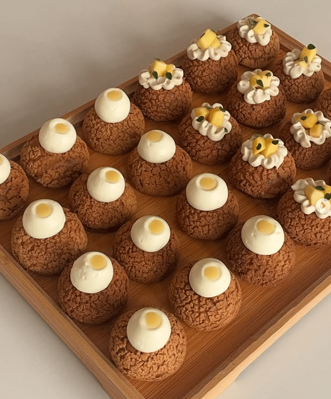 招牌是他们家的泡芙,choux au craquelin,一咬下去外层是酥脆的,会有一点轻轻碎开的感觉,里面的馅是满的,不是空心那种,质地偏滑顺但不会水。像蓝莓碎口味,会带一点微酸,吃起来不会腻。还有一个被很多人提到的是 Matcha Yuzu,抹茶的苦味是轻的,柚子有一点清香,整体是清爽型。