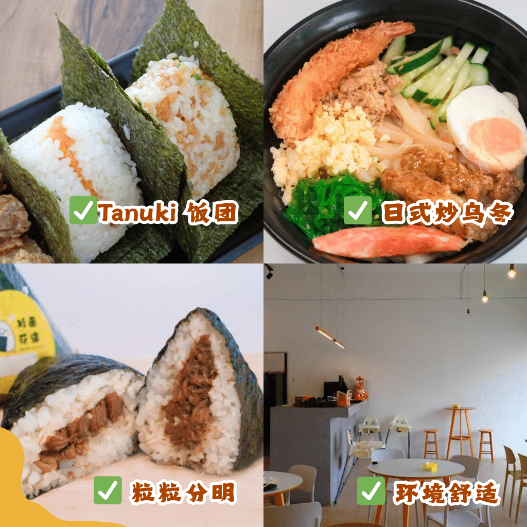 有些人买回办公室当午餐。有些则是下午三四点,当作小小的下午茶。如果想吃比较饱一点,这里也有 日式照烧鸡肉饭 和 日式炒乌冬。照烧鸡的表面会有一点微焦色,酱汁带一点甜味。乌冬面则是粗粗滑滑的,吃起来很有弹性。店面不大,但灯光偏暖色。有时候可以看到学生坐在角落,一边吃饭团一边聊天。